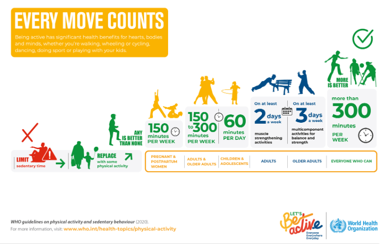 A rendszeres testmozgás kulcsfontosságú az egészséges életmód szempontjából. A fizikai aktivitás nemcsak az izomerő növelésében és a testsúly kontrollálásában segít, hanem csökkenti a szív- és érrendszeri megbetegedések, a cukorbetegség és bizonyos daganatok kockázatát is. A WHO 2020-as fizikai aktivitási irányelvei a felnőtteknek heti 150 perc közepes, vagy 75 perc magas intenzitású testmozgást javasolnak. Egy a közelmúltban készült tanulmány kimutatta, hogy a világ felnőtt lakosságának közel egyharmada (31%), azaz 1,8 milliárd felnőtt fizikailag inaktív.1